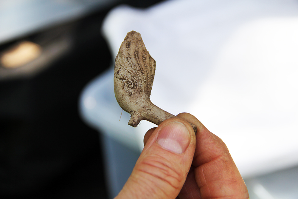 Några andra fynd som gjorts är kritpipor som går att datera genom den dekor som finns på pipan. De användes för att röka tobak och var vanliga under 1600 – 1800-talet. Ann visar också upp bland annat keramik, rödgods och benrester.