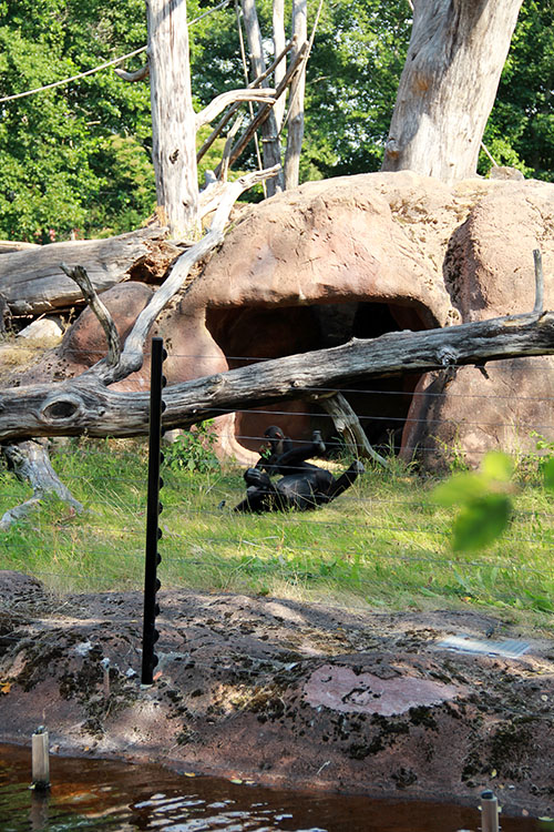 Sandra tar med oss på en rundtur och vi gör första stoppet hos schimpanserna. En av dem leker livligt med det senaste tillskottet Torsten, som bara är två år gammal.