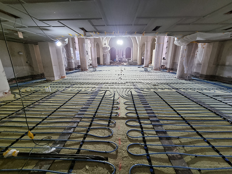 Leveransen av värme utökades under samarbetet och det beslutades också om vattenburen golvvärme i den stora kyrkosalen. Ett moment som kan liknas vid ett tungt och jättestort pussel. Hela kalkstensgolvet plockades försiktigt bort bit för bit, numrerades och sen gjordes allt arbete på golvet. Till sist la man tillbaka stenen på mer eller mindre samma plats som innan.