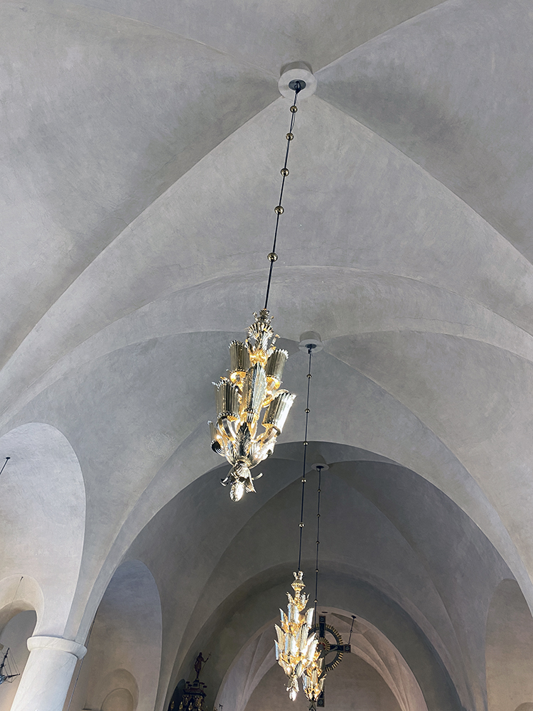 - De stora valven i kyrkosalen har varsamt gjorts rent under renoveringen. Under årens lopp så fastnar små sotpartiklar från alla ljus, så då blir valven gråa och skitiga. Ungefär var 50:e år måste man göra rent dem. Det är en målerikonservator som använt akapadsvamp och tvättat alla valven för hand.