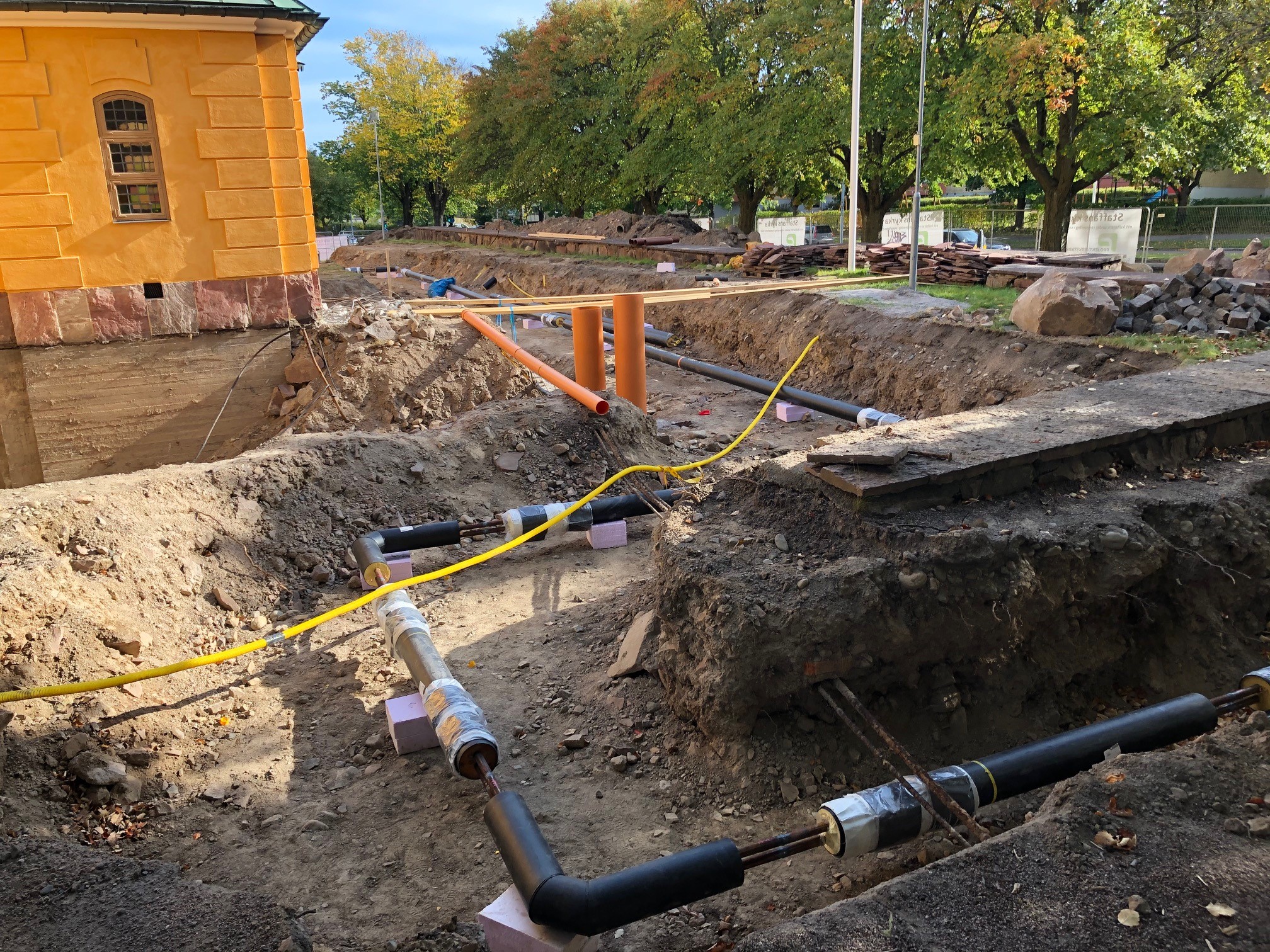 Gävle Energi schaktade fram till tomtgränsen sen tog KFS gräventreprenörer över. Fjärrvärmeledningarna läggs på 60 – 100 centimeters djup.