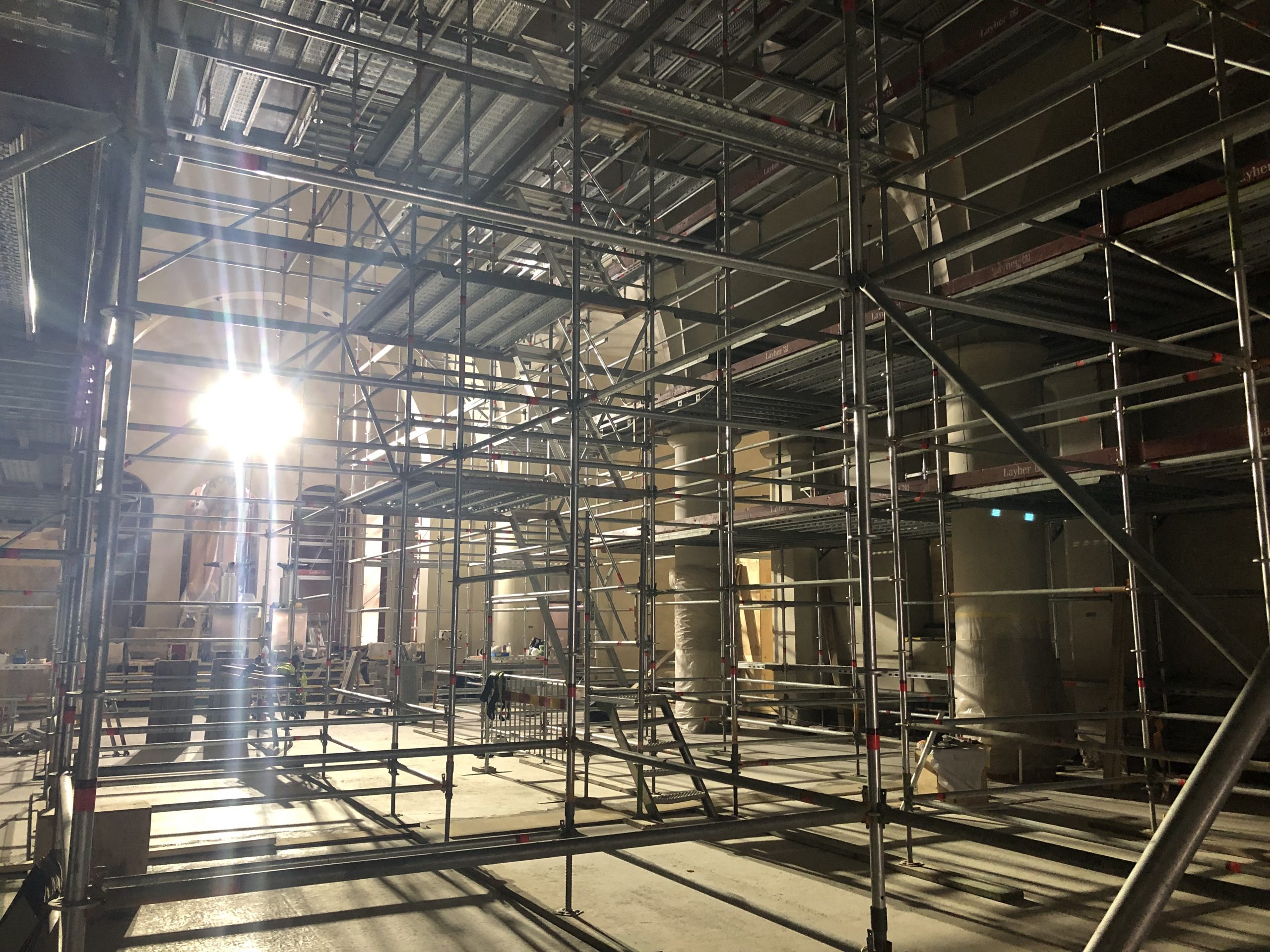Vi börjar med att titta in i samlingssalen som ska användas som församlingslokal för bland annat barnaktiviteter, begravningsfika och konfirmandträffar. I det ljusa och stora rummet var det tidigare ingenting, helt enkelt fyllt med jord ända upp till taket. Grundläggningen av kyrkan var också en utmaning när man skulle få till ett rum som kunde användas på många olika sätt.