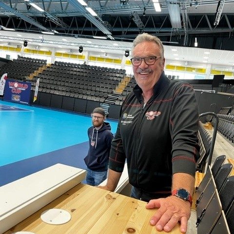 Vi passar på att träffa spelarna i KF Heros Johanna Mårtensson och Cecilia Bostrand tillsammans med Henrik Bostrand och Christer Ring i Gavlehovshallen, som är den eldsjäl som håller i arrangemanget. Med sig har spelarna varsin elinnebandystol som de värmer upp i medan Christer och Henrik monterar beachflaggor.