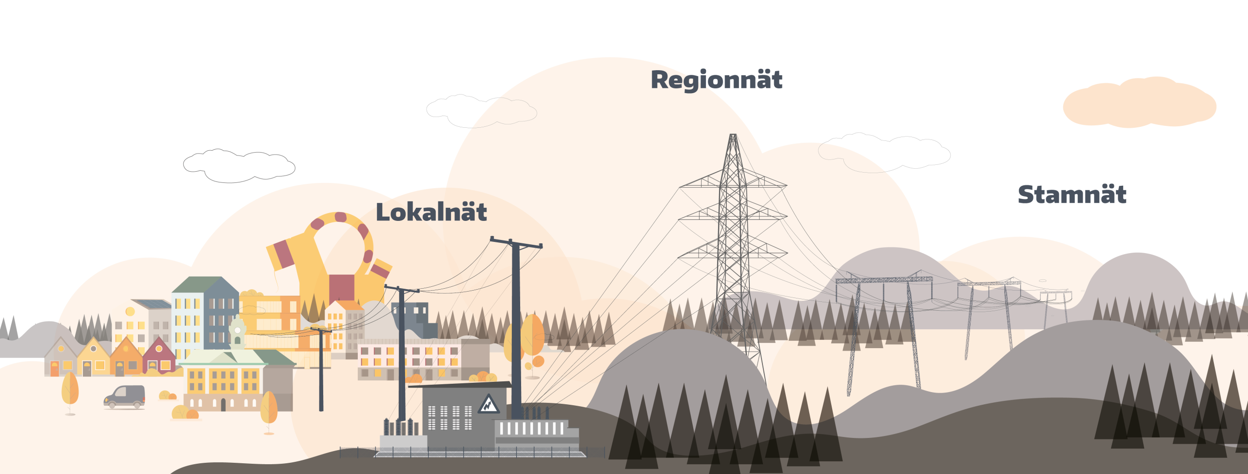 Elnätet är vägnätet för el. Precis som vägarna tar oss mellan städer och hem, leder elnätet elen från kraftverk till hus, företag och laddplatser. På vägen byter elen både spänning och väg – i flera steg: stamnät, regionnät och lokalnät.