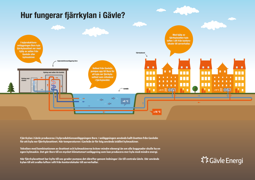 När fjärrkylevattnet har kylts till sex grader pumpas det därefter genom ledningar i ån till centrala Gävle. Där används kylan till att svalka luften i allt från kontorslokaler till serverhallar.